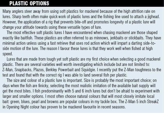 There are many ways to target mackerel and the best method is often dictated by the mood in which they are found. Aggressive fish looking for larger baits are easily tempted by large hardbody lures, metals and live and dead baits. However, there are those tough days that aren’t always easily explained; they often follow periods of good fishing as the moon phase and barometer begin to mature. Regardless of the reason, when I find the fish in a subdued state, experience has shown me that I can still get them to eat a plastic. There may be several reasons for this: I believe it has much to do with the fact that these lures produce less aggressive vibration and flash, and are the best imitation of a lone baitfish. I remember a mate recounting a story of a recent trip whereby school-sized Spanish mackerel were cruising around the boat and although turning to inspect every lure cast at them, refused to eat anything. After questioning him further I discovered that the only lure they hadn’t thrown was a soft plastic.