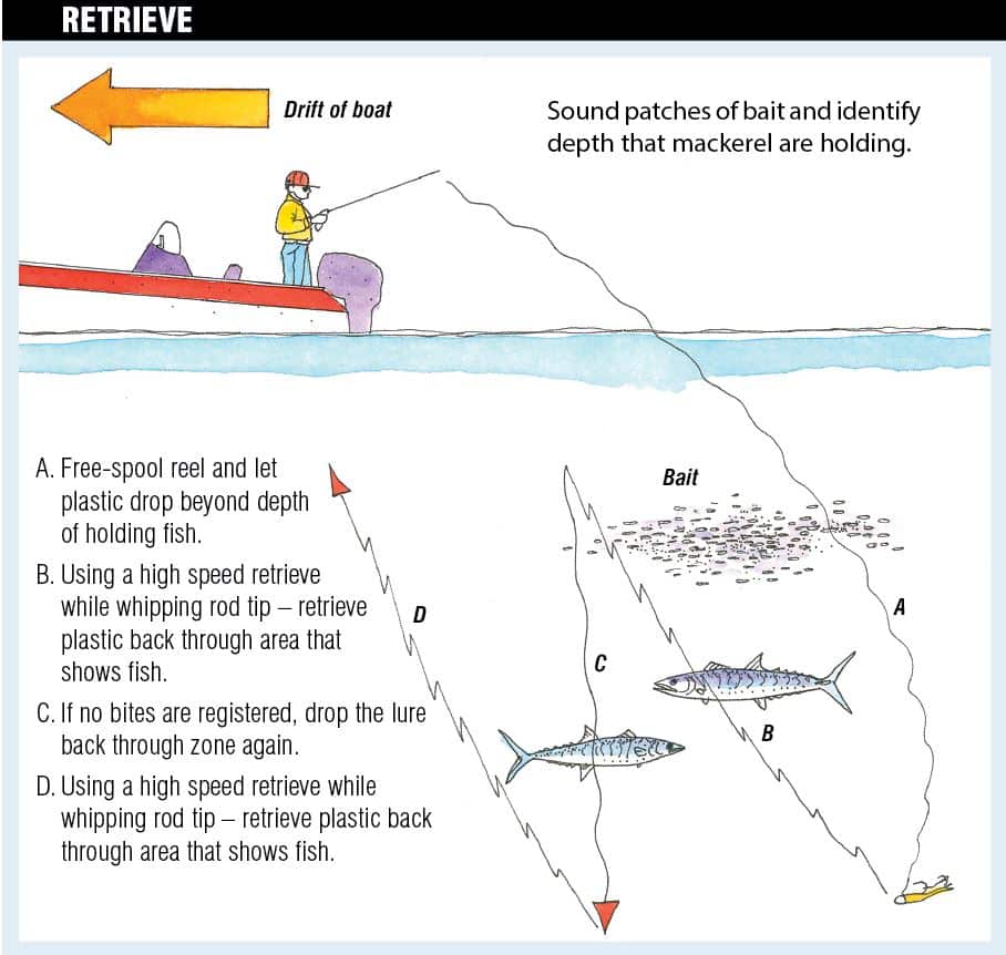 Two scenarios will be found when chasing mackerel. The fish will be actively chasing baitfish near to the surface, or they will be feeding in deeper water. Surface fish are easily found and more easily targeted with a lure. Casting to the edges of surface feeding expressions and retrieving the lure away from the activity will often produce strikes from cruising fish. The advantage in this situation is that an angler can quickly identify the size of the bait being attacked: this makes it easy to imitate bait with a well-suited plastic. Experimenting with time taken to let the lure sink before retrieving is worthwhile. Often large fish will feed a few metres beneath the surface bait. A lure allowed to sink for 5 to 10 seconds before being retrieved often receives plenty of attention.