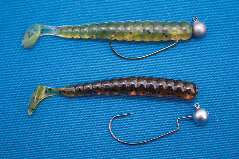 - The top grub in this image is rigged straight with the hook exiting the soft plastic body on the 6th rib. The bottom grub is rigged “short” with the hook exiting at the 5th rib in the soft plastic body. Notice how the tail hangs lower in the bottom grubs which will deliver a slightly different action and imitate a wounded baitfish.