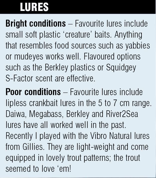The fish hadn’t known I was there and my lure presentation had been subtle. What had caused the fish to respond in this manner was perplexing until I put it at the back of my mind after spotting another shallow water brown cruising. This fish was cruising faster and I had to make a quick cast to put my soft plastic 5 to 6 m ahead of it. Similar to the previous one, this fish sensed food was on the menu and its fins shuddered and it picked up speed. I ever so slightly jigged the scented lure and the fish paused and inspected its location before it too, thought better of it and swam for deeper water. I spotted 15 fish that day and cast at around eight. All fish were following a similar pattern of migration around the lake foreshores and I managed to fool and catch two solid 2 to 3 kg brown trout; the only difference with those fish was that I positioned a lure 20 to 30 m ahead of the projected line of travel.