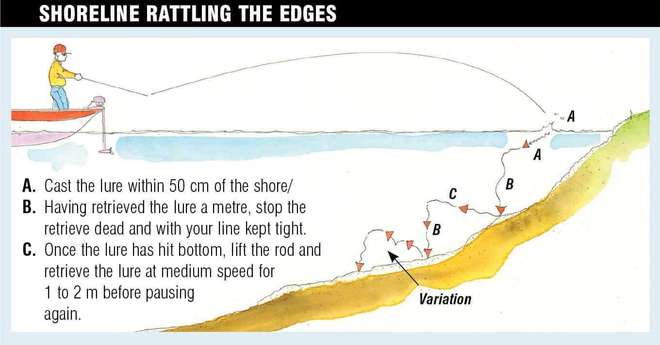 Fish hunt windswept shorelines aggressively when the weather turns poor. An aggressive technique can produce some awesome fishing. Drifting wind-blown shores in a boat and retrieving rattling crankbaits across the shallows is a very effective method. Try to develop long drifts that allow the boat to be pushed along a cast length from the bank. The rattling approach is noisy by nature but you can still make it look natural. Remember that a small baitfish suddenly finding itself exposed to a predator will behave in a certain way. Let’s look at how you retrieve it to look the part. (Also refer to diagram above).