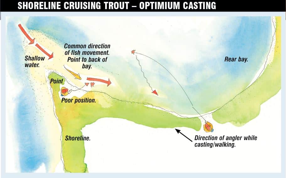 Watching fish cruise a shoreline teaches you much about how they operate. Fish will usually cruise with purpose along a predetermined route watching very carefully for any signs of impending food or danger. They very often move in the same direction. A common path often includes moving into the shoreline via the shallow water that extends from a shoreline point. These fish will then turn and cruise along a shoreline until they reach the back corner of a bay before moving into some deeper water. They will often return to do it all again if they find reason (food) to return. Observations suggest that if these fish are met with anything that seems abnormal, they head for safe territory.