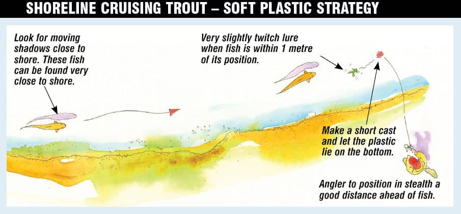 The fish hadn’t known I was there and my lure presentation had been subtle. What had caused the fish to respond in this manner was perplexing until I put it at the back of my mind after spotting another shallow water brown cruising. This fish was cruising faster and I had to make a quick cast to put my soft plastic 5 to 6 m ahead of it. Similar to the previous one, this fish sensed food was on the menu and its fins shuddered and it picked up speed. I ever so slightly jigged the scented lure and the fish paused and inspected its location before it too, thought better of it and swam for deeper water. I spotted 15 fish that day and cast at around eight. All fish were following a similar pattern of migration around the lake foreshores and I managed to fool and catch two solid 2 to 3 kg brown trout; the only difference with those fish was that I positioned a lure 20 to 30 m ahead of the projected line of travel.