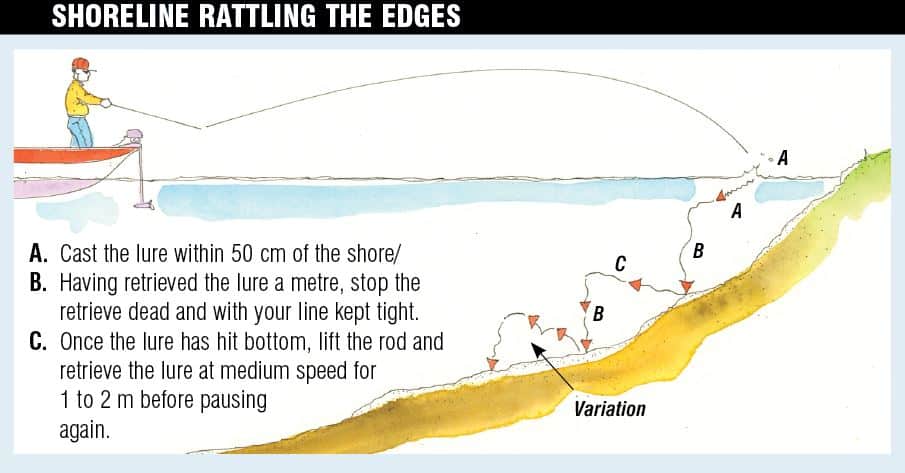 Fish hunt windswept shorelines aggressively when the weather turns poor. An aggressive technique can produce some awesome fishing. Drifting wind-blown shores in a boat and retrieving rattling crankbaits across the shallows is a very effective method. Try to develop long drifts that allow the boat to be pushed along a cast length from the bank. The rattling approach is noisy by nature but you can still make it look natural. Remember that a small baitfish suddenly finding itself exposed to a predator will behave in a certain way. Let’s look at how you retrieve it to look the part. (Also refer to diagram above).