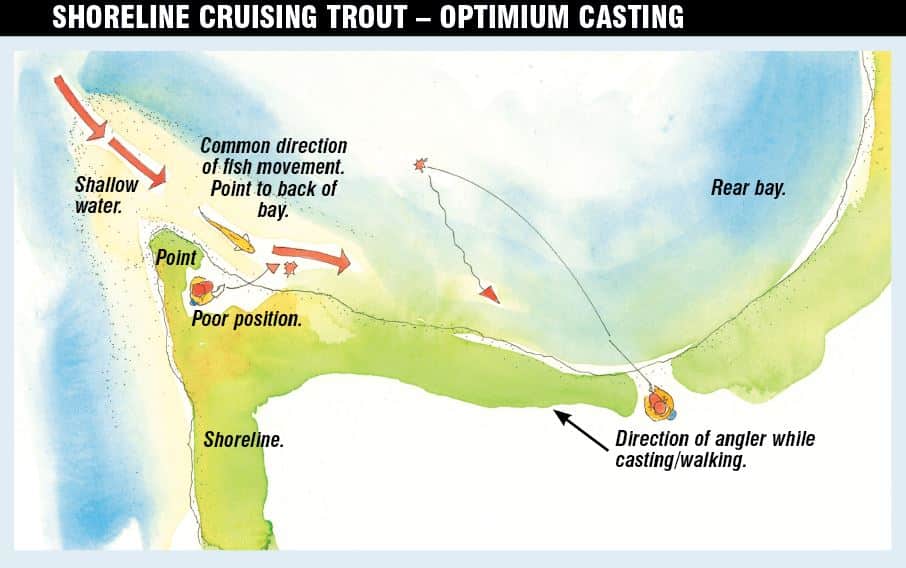 Watching fish cruise a shoreline teaches you much about how they operate. Fish will usually cruise with purpose along a predetermined route watching very carefully for any signs of impending food or danger. They very often move in the same direction. A common path often includes moving into the shoreline via the shallow water that extends from a shoreline point. These fish will then turn and cruise along a shoreline until they reach the back corner of a bay before moving into some deeper water. They will often return to do it all again if they find reason (food) to return. Observations suggest that if these fish are met with anything that seems abnormal, they head for safe territory.