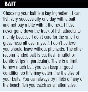 Selection of gear is a personal choice and I believe there are many successful combinations. I recommend combinations that include 4 to 5 m surf rods; a side cast reel and 6 to 10 kg of monofilament line. My favourite outfit these days includes a 700 Alvey Drag matched with a Gary Howard 5 m surf rod and I stick with the Platypus lines: Super 100 or Lo-Stretch. I generally have several rods with me and I will set them up differently for a night fish. That way I am rarely re-rigging in the dark. Try different size rods and reels until you find a combination you are comfortable with. To experience success on large tailor you have to be comfortable with all aspects of the gear which includes casting, holding the weight and controlling the fight. I select a rather whippy rod as it allows me to easily feel a bite and the flex in the rod provides some shock absorption when the fish decides to go in a different direction than you intend.