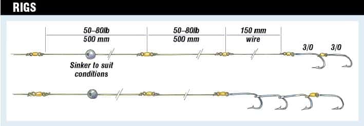 flesh baits is a 5/0 connected to a 2/0 (by a swivel if necessary). I generally add a small length of wire for the shorter rigs (say 150 mm long) and some 20 to 40 kg leader before the sinker. Always use good quality swivels and leader. Platypus Hard Alloy has survived all the tests I have put it through.
