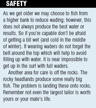 Choosing a location for fishing is very important and an angler’s eyes are key tools for identifying prime locations. Colour changes in the water and the way waves roll or break often depict changes in the depth of local water. Finding some form of deeper water where tailor can target bait with some cover are key ingredients to finding them.