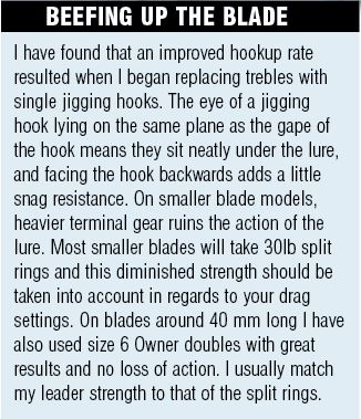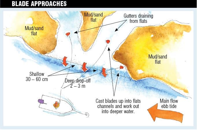 One trick I’ve learnt in north Queensland is to look for barra in areas that are commonly frequented by large flathead during the cooler months. Seek out large flats that flood during the make, as big barra will hunt in the same shallow, warm water. Then, as the tide recedes, move off the flats and target the gutters that run off and into the river proper. Casting a blade up into these draining channels and then slowly hopping the lure back out and into the deeper water is a dynamite technique. Sometimes a constant, medium paced retrieve can see your blade hammered as it imitates a fleeing baitfish that appears to be following the water draining off the shallows. The beauty of using blades is that you can access every available inch of the water column by varying your retrieve.