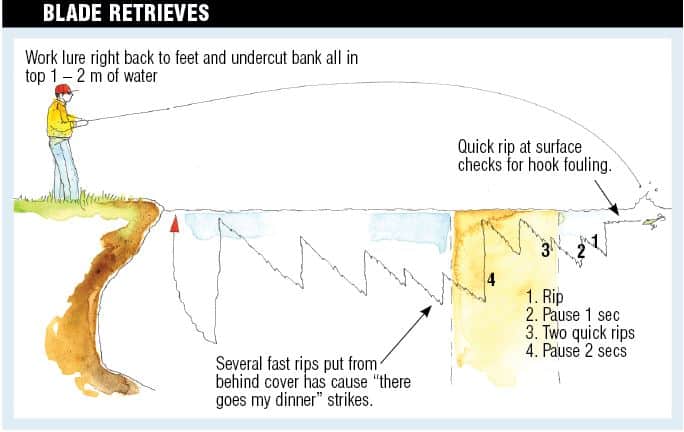 Vast schools of freshwater baitfish and fry get trapped in these areas, and the post spawn barra gorge themselves to put on condition. Again, blades come into their own in this scenario, due to the generally diminutive size and baitfish resemblance that they possess. Working a blade through or around these bait schools will often result in a hookup.
