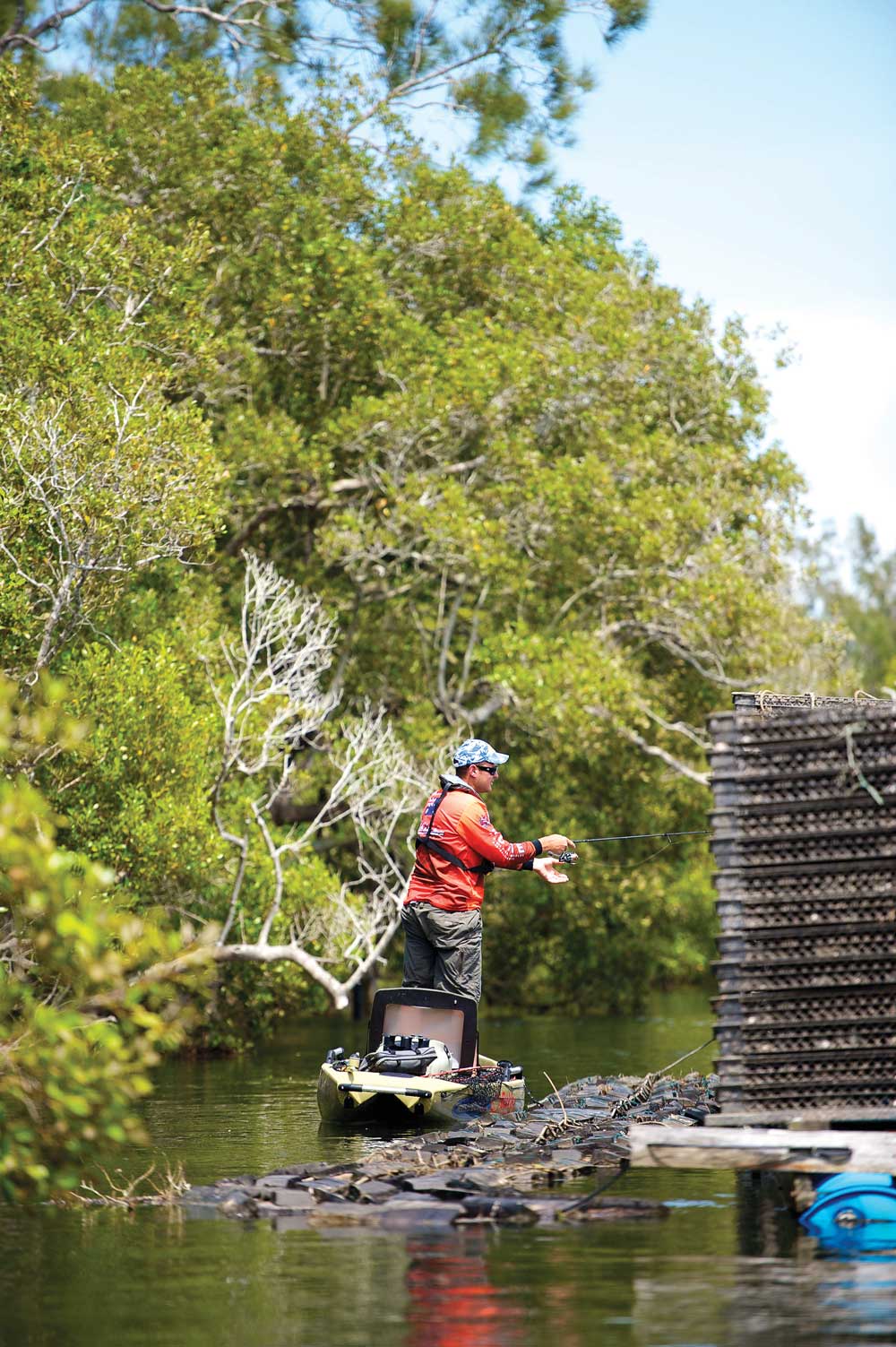 One thing that is worth mentioning is the idea of using a baitcast outfit. Tackle technology has come a long way in the past decade and we now have the ability to present lighter, bream-sized lures on saltwater friendly baitcasters with beefy drags. The fact is braid fares very poorly in sharp areas but monofilament and fluorocarbon over about 10 lb perform much worse on spinning reels. So we have taken the lesser of two evils but the idea of using 16 lb fluorocarbon with excellent abrasion resistance straight through on a small baitcast outfit is on the horizon and a few keyed in people are testing the limits of what we can do differently.