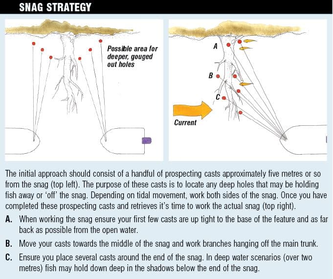 Another effective way to prospect the perimeters of a snag, searching for that elusive nearby ‘honey hole’ is to use a suspending or diving minnow. The method is relatively straight forward and consists of working lures approximately 3 to 5 m either side of the snag and then gradually working repeat casts closer to the snag. My approach is to deliver 2 or 3 prospecting casts around the perimeter before working the actual snag (See Fact Box: Snag strategy). If I can’t generate any interest from the snag I will revert bag to searching for a deep hole nearby. This method works best only in slow to moderate current.