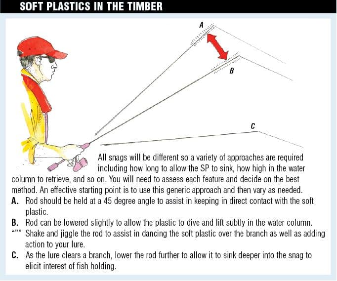Using a similar approach to the floating hardbody; cast as close to the bank as possible towards the base of the tree. While keeping your rod tip at a 45 degree angle slowly work your retrieve. Attempt to ‘feel’ or roll your way over and across the branches. As you feel your soft plastic fall free of the branch, cease winding while dipping your rod slightly to allow your lure to transcend down. Anywhere from only a few centimetres to half a metre should suffice. Now lift your rod again slowly and commence winding again (See Fact Box – Soft plastics in the timber). Ensure you rig your soft plastic with the hook riding up to minimise snags. If you have only just started working the snag I always opt to bust off and re-rig rather than drive the boat in to unsnag as this will spook any fish holding under the timber. Ensure you keep your jighead weight to minimum with half and one gram heads more than sufficient for this type of lure work. I only ever up the weight to 2 grams if I’m fishing snags in water greater than 3 m deep.