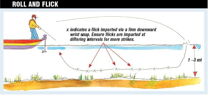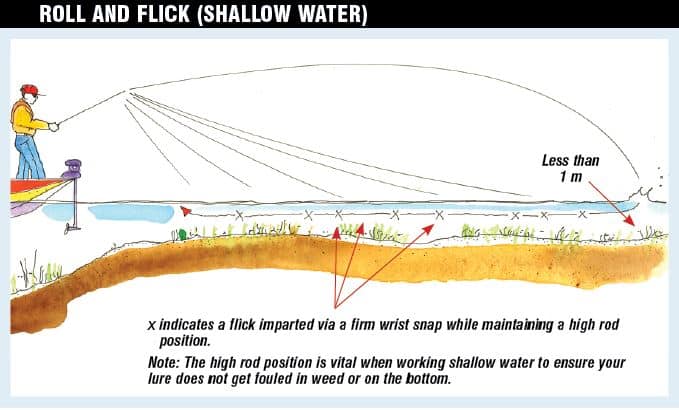 As the tide reached the last portion of the run out, anywhere from an hour to two hours before dead low, we would alter our retrieve to a slightly more conventional ‘Roll and Flick’ (RAF). The RAF method is best executed with the ever-reliable soft plastics in the form of flick baits, jerkbaits, and stick baits. This is a relatively simple technique that entails a slow roll with a flick imparted into the retrieve at differing intervals (See Fact Box – Roll and Flick). The flick is imparted onto the lure via the rod tip and a firm, downward wrist flick. If in ultra-shallow water a higher rod position may be required and the wrist flick can be performed in a skyward manner. Regardless, the trick is to replicate a fleeing baitfish while ensuring your retrieve is super-slow. Many anglers can comfortably perform a slow roll but once they impart a flick their retrieval speed increases. Concentrate hard after the wrist flick to return your lures pace to the post-flick speed. This is deadly on all estuarine species, with the overall retrieval speed the key in winter. We have found this to be an excellent prospecting tool that allows us to search vast areas of shallow muddy flats in good time.