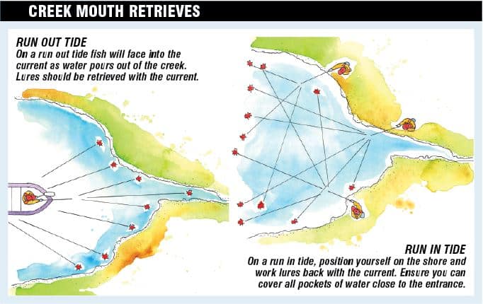 Another highly productive area is the open water adjacent to creek entrances and tidal run off zones. Flathead sit wait here in ambush; waiting for prey. Fish can be found anywhere from 50 plus metres away from the mouth, right up to the entrance of the creek, depending on the tide. At the start of the run out fish will be spread across the general vicinity of the run off area and should be targeted accordingly. As water spills from the creek or the flats; fish will move closer to the actual drop off area. Once in position they will select a lie and partially bury themselves. The difference here is that the predators are highly attuned to their surroundings and will be on alert for a bait moving across the drop zone. This means fish will move some distance to attack a lure. I have seen flathead swim several metres in clear, knee-deep water to nail a small minnow or popper. The direction of your retrieve is important, as the fish will lay face first into the current. Retrieves must be made with the current or slightly diagonally across the current (See Fact Box – Creek Mouth Retrieves).