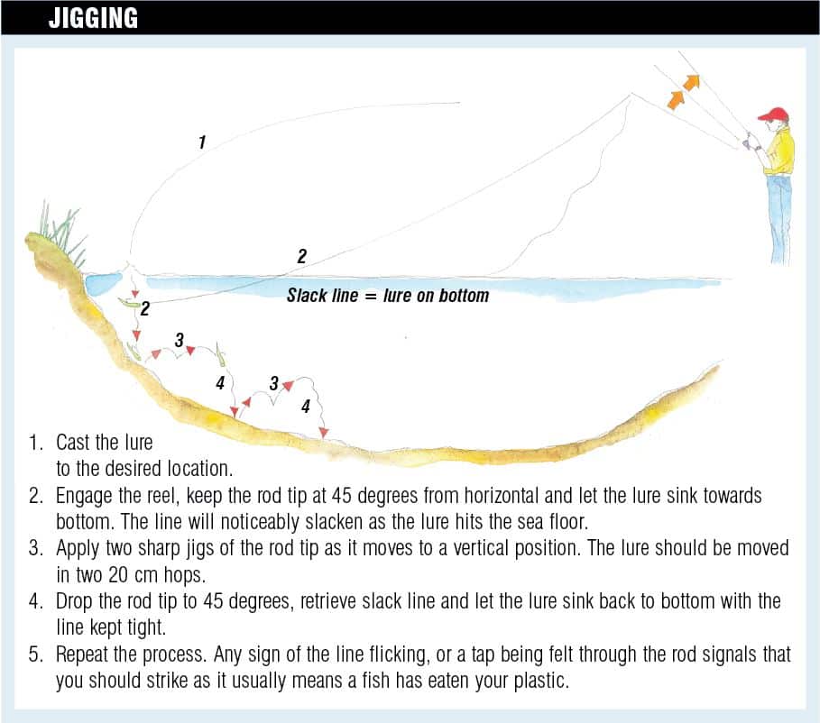It would be fair to say that most fish spend time feeding close to the bottom. Jigging a lure close to the substrate accounts for a large number of fish when using curl tail plastics. The style of jigging should vary depending on the mood and type of fish being targeted. For example, flathead will often respond to an aggressively jigged curl tail kept close to the bottom, while bream, trout and the like will be more susceptible to a subtly jigged plastic. It is important when jigging to ensure your lure stays in contact with the bottom for extended parts of the retrieve. Today I notice many anglers fishing too quickly. After having identified prime fish holding locations ensure your lure is jigged along the bottom for as much of the area as possible and your success rates will increase. This means watching your line for signs that the lure is on the bottom, moving the lure so that it does not move too far from fish and then ensuring you wait for the lure to once again hit the ground. Learning to watch the line carefully will highlight when a lure has hit the bottom and also when a fish has bitten a lure as it drops. Experiment with how you jig a lure and it may surprise how varied retrieves will stimulate bites. I have taken fish on aggressively jigged lures, gently hopped plastics and at times by slowly dragging them along the bottom. Keep in mind that many plastics are buoyant these days which means a curl tail lure will stand up enticingly when on the bottom. The one aspect in your favour when jigging with grubs is that the lure is always wiggling: which means you have a chance of getting that bite at any stage.