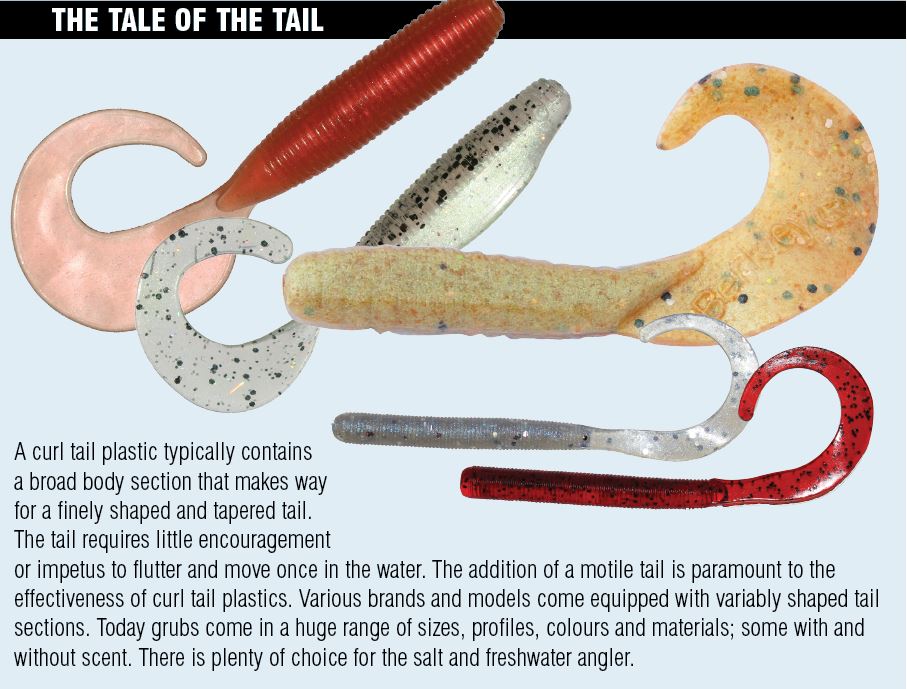The action of a tail adds other important characteristics to these lures as well. A vibrating tail acts to retard the speed of a grub when sinking or being pulled through the water as an example. This is an important consideration when trying to fool cautiously feeding fish. Species such as snapper will often fall for the charms of a slowly sinking grub. Slowly retrieved plastics with an actively vibrating tail are often the catalyst to get species such as freshwater trout and bass to bite. Several curl tail plastics on the market now offer a buoyant body. A weighted lure will lie prostrate on the bottom while a proud tail sits upright, wiggling seductively and attracting the attention of salt and freshwater species searching for crustaceans and the like. A curl tail lure may appear at face value like nothing more than a lure with body and tail, but when you scratch beneath the surface you begin to appreciate how versatile and effective these lures really are.