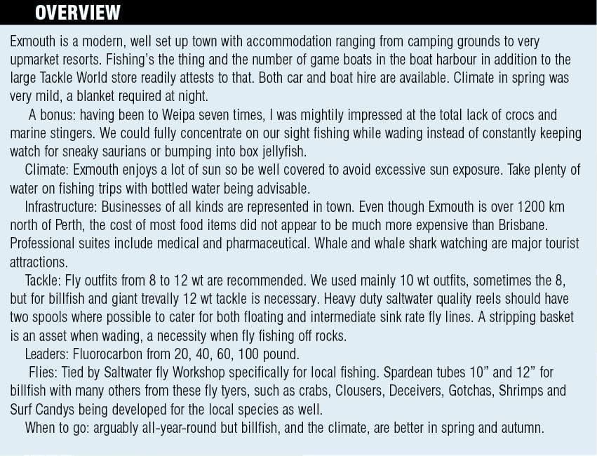 For our fly fishing trip of a lifetime, Denise and I opted for just over a week at Exmouth in spring last year. Billfish were the main game but we planned both land based and offshore fly fishing to see what the area had to offer.
