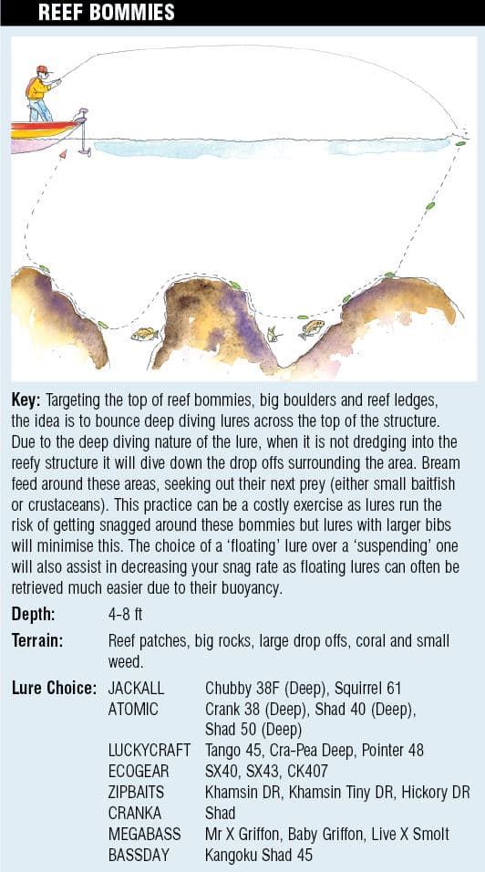 Terrain is probably the biggest influence on lure choice as it provides great insight to a bream’s eating habits. For example, shallow rubble flats may mean bream feed along the bottom; crunching shells and hunting for crustaceans while herding baitfish into shallow waters. As opposed to reef bommies, which may mean bream cruise the deeper drop offs to ambush baitfish and target reef ledges for shrimps and other small resident fish. So taking these factors into account can give you an indication of what lure to cast in certain environments.