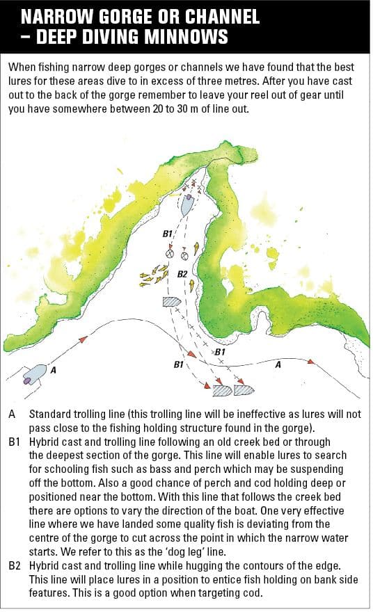 This method is specifically used in narrow ‘fingers’ of water, which are commonly found in impoundments and occasionally in stretches of some of the larger western flowing rivers sprinkled along parts of NSW, Victoria, and southern Queensland. These narrow fingers of water generally exist in two distinct forms but require a marginally different approach. The first areas are deep gorge or channel type waters and the others are narrow, relatively shallow bays or inlets. There are several issues lure fishers face when attempting to work divers in these narrow passages. Most obvious is that a standard trolling approach is not possible as there will be insufficient space in the skinny corridor for which to turn the boat around. The other issue is that if you opt to cast and retrieve, then your lure will either not be able to attain its optimum diving depth, or if it does reach that depth while retrieving, generally it will only track at that depth for a short period of time before it begins to ascend up the water column, back to your rod tip. This is caused by the limitation in the amount of line, which has been cast out.