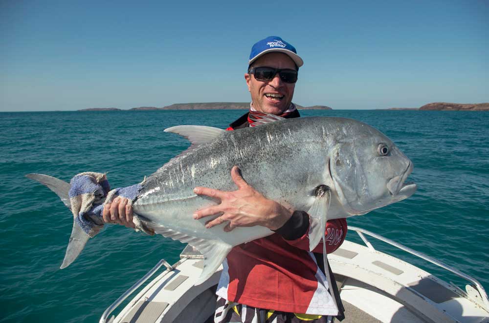 It was after lunch on day four of our Kimberley adventure. After catching several giant trevally on poppers up to 40 pounds in the last two sessions, my guide Gary suggested i “have a rest” from casting, and tied on a Halco Laser Pro for a troll around one of the many rocky outcrops that litter Montague sound. Given the brutal encounters that we had all experienced up to this point with the resident GTs, I gripped my E-Force 15kg rod tightly in anticipation of what was likely to happen next, within moments the lure was hammered by another GT that put on the after-burners as it headed for the safety of the rocks. Hanging on for all I was worth, Gary put the hammer down and pointed the boat in the opposite direction from the bommies, all the while the drag was screaming as 80lb braid ripped through the guides. Luck however was on my side and eventually my fishing buddy Ray could get a metre of black backed giant trevally safely in the net. After a quick photo session and release of the fish, I lay back on the casting deck shaking my head in disbelief. This was to become a regular occurrence on this trip.