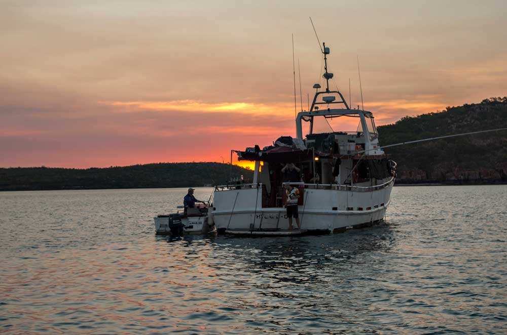 The tail end of the dry season (August/September) provided the most reliable weather patterns for exploring and fishing the Kimberley coast, with light winds, temperatures in the mid-30s and low humidity the norm. Mal has the Hyland C stationed at various places along the Kimberley Coast for two months around this period. Groups of anglers are flown in/out via sea plane to the ship every eight days. The beauty of this system means that you are straight into the fishing action from the moment you step on-board to the moment you depart the mothership.
