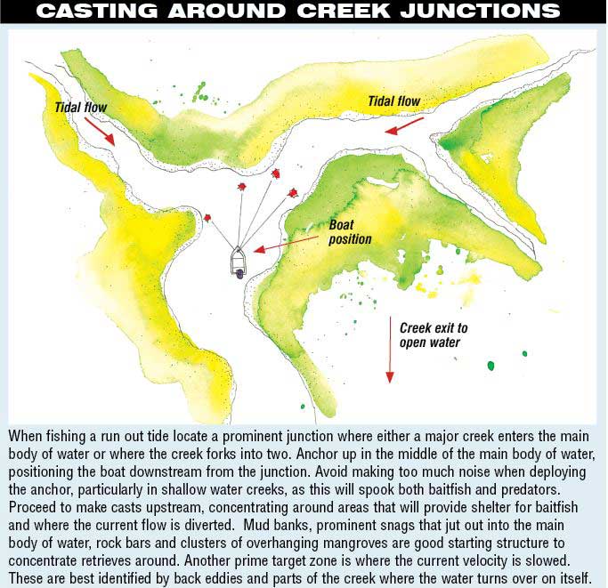 Tidal flow is critical in most estuarine scenarios and chasing jacks in creeks is no different. The saying, ‘No run, no fun’, is right on the money when these brawlers are your prime foray. A receding tide can produce some of the hottest bites as baitfish are forced off the flats and from within the sanctuary of the thick mangroves and out into more open water, where they are easy prey for predators. The last hour or two before low tide is what I consider prime time. As mentioned, baitfish are forced out into open water with only minimal cover, meaning less water between them and the jacks.