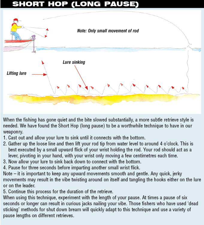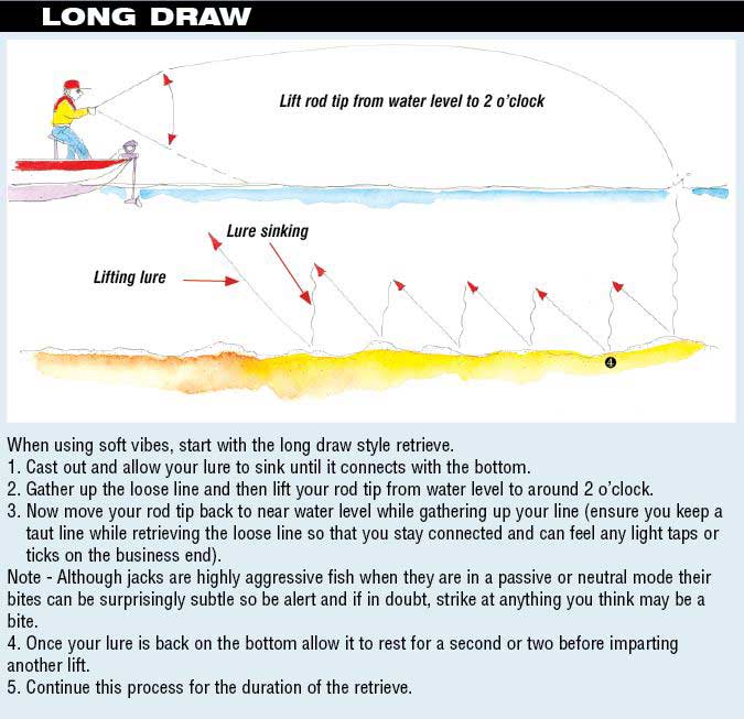 Also playing into the angler’s favour during low tide is the little to no water under the mangroves. This means they are forced to relocate temporarily. Predatory jacks use this opportunity to hunt. On a recent trip up north we experienced several productive sessions just prior to dead low tide. The schooling jacks had moved into the middle of a couple of small creeks and held position in trenches and gulling along the bottom. At first these fish were difficult to target, as our diving hardbodies were not getting down deep enough. A strategic switch to soft vibes paid dividends as this genre of lures proved the downfall of numerous quality jacks. We used a mix of retrieval styles with the standard long draw and drop working well on most occasions. When the fishing shut down we found the ultra small hops and extended pauses produced strikes when everything else failed (See Tech Tip – Short Hop (long pause).