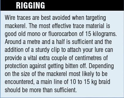 Of course, there are other options which also work. Halco Twisties are well worth using and being more compact in shape, can be cast a long way on spin tackle. Longer bodied jigs are also attractive to mackerel, but you will have to do away with nylon rigged assist hooks or you won’t land too many fish. The bottom line is, if it is shiny, sinks and can be cranked back fast, it will probably catch mackerel.