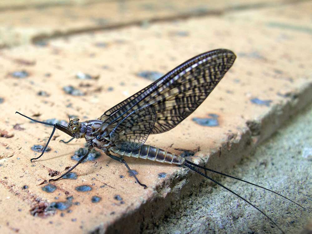 to orange and some are cream. As in many mayfly species, the males tend to have larger eyes, longer forelegs and are usually a bit darker.
