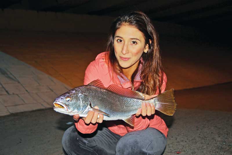 - Kristyna Perri displays a bridge dwelling mulloway that she managed on a bent minnow around a tide change during winter.