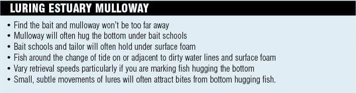 Under the myriad of baitfish will be larger predators such as tailor, salmon and juvenile mulloway. At the very base of this piscatorial food pyramid will be the larger mulloway, and in some systems, sharks. To successfully find the correct the water depth to work your presentations you will need to work all levels of the water column with a methodical approach. I tend to work the bottom layer thoroughly before decreasing the depth of my retrieve. If you have marked large fish holding mid water you should obviously work this band of water immediately rather than waste casts, and possibly spook fish, by working retrieves underneath the fish.
