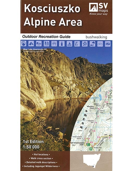 The main map covers an area from Khancoban in the west to Jindabyne in the east, and includes the major ski resorts of Perisher, Thredbo and Charlotte Pass. On the reverse, the map area extends northward to include the Jagungal Wilderness Area, noted for its wilderness bushwalking experience.
