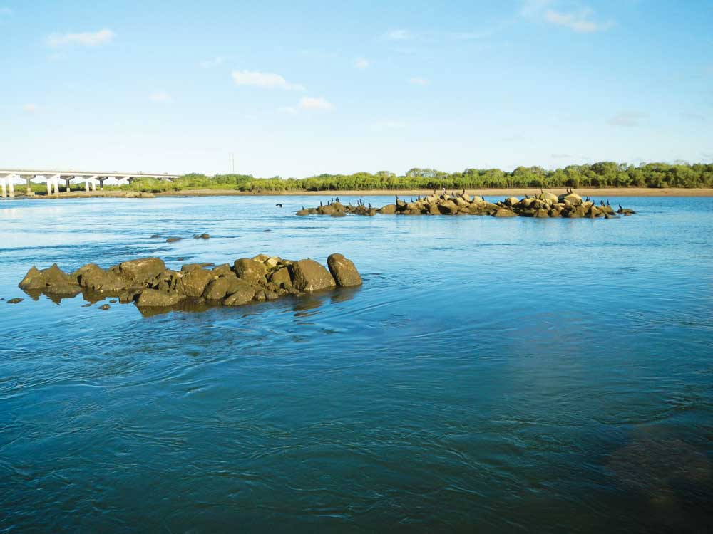 Structure such as rocky outcrops and bridge pylons are excellent choices when specifically targeting these fish. One reason is that they hold permanent bait schools, but further to that, they create eddying backflows and pulsating flow surges with each tidal cycle.