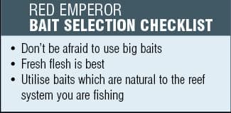 The feeding habits of red emperor provide the key to choosing effective baits. As ambush predators, reds are very responsive to dead baits but can also be targeted using live baits. To start with, large flesh baits are ideal. Fresh mullet and tailor are as effective as red baits go. Other great flesh baits include species which are caught within the reef system in which the reds are feeding. In Queensland, hussar is commonly caught in the vicinity of red emperor and a fresh hussar fillet is one of the best red emperor baits on offer. Other flesh options include trevally, iodine bream and tuna. Fresh squid is also a great option with many of Central Qld’s offshore reefs holding large numbers of these tasty critters. One key consideration of bait selection is size. Red emperor have huge mouths and sometimes it takes a large bait to get their attention. Don’t be afraid to drop down some really big baits. My PB red of 14 kg nailed a whole 45 cm tailor frame after its fillets were previously deployed as flesh baits. Whole fish baits, dead or alive, can also be effective. Yellowtail scad (yakka), slimy mackerel and pike are the pick of the bunch.