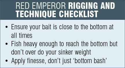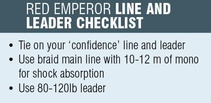Red emperor can be brutal on your gear and the fight is often won and lost in the first few moments after hook up. For this reason, you need to have supreme confidence in your line, leader, terminal tackle and drag capacity of your reel. The keyword in that last sentence is confidence. Just like you have a ‘confidence’ lure for chasing flathead or snapper, use line, leader and gear that you’re confident will stand up to a big red emperor.