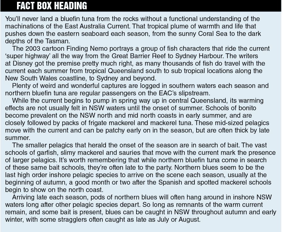 When targeting most species you will most likely check what conditions are like on a given day, matching up tide, water temperature and whatever other variables you take into account. When you’re targeting bluefin from the rocks, you’re really looking at the bigger picture; you target these fish over a season rather than just a single session.