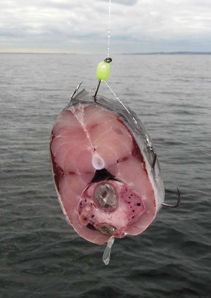 Big snapper will take big baits and heads of species including barracouta, salmon and mullet. King George whiting is an excellent bait when fresh, and in November and December there are plenty of ‘just size’ whiting about that are the ideal size for whole baits. Cuttlefish is effective and like octopus, improves with age in the water. Over the past couple of years I have taken to freezing salmon then taking it out on the water still frozen where I cut it into cutlets. The internals of the salmon stay in for long enough to cast and I believe add to the attraction in the same way as chopping the tail off a pilchard allows oils to seep out.