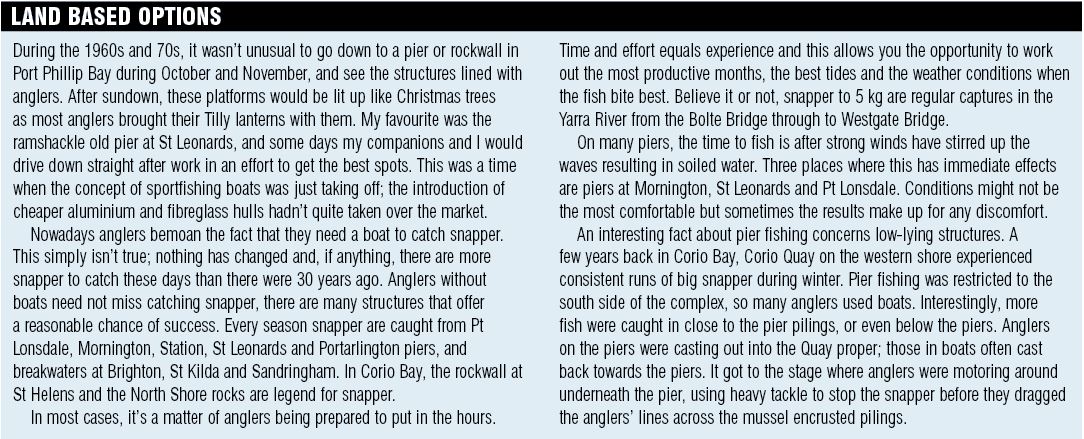 Last November, Graeme Bucknall called to tell me the snapper were running in the shipping channel near the Wilson Spit, off Clifton Springs. We had the same GPS mark. Found separately, it was an old channel marker support pole, broken off a few years ago when the port authority installed new navigation lights. Now overgrown with weed and molluscs, the broken pole sits on the channel edge, shown on the sounder as a large, overgrown lump: a reef system, albeit a small one, but enough to hold snapper.