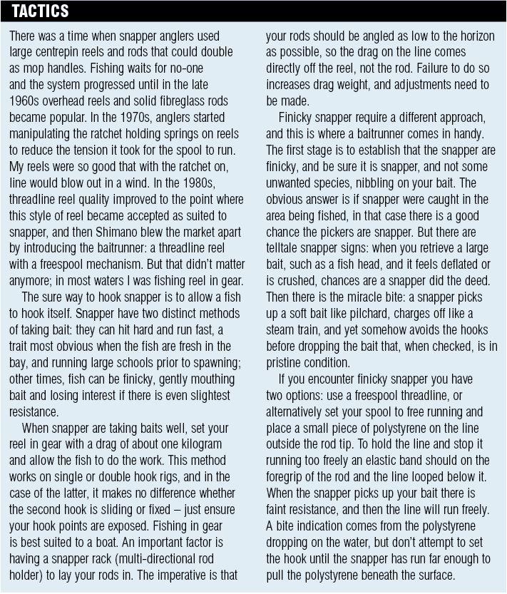Opportunistic is a kind way of describing what snapper feed on, which ranges from chewing gum and apple cores through to chops and chicken. Despite this, snapper prefer fresh bait and my favourites are squid, salmon and pilchard. Last season salted pilchard, a bait I disavowed more than 30 years ago, proved to be the hot bait where I fish.