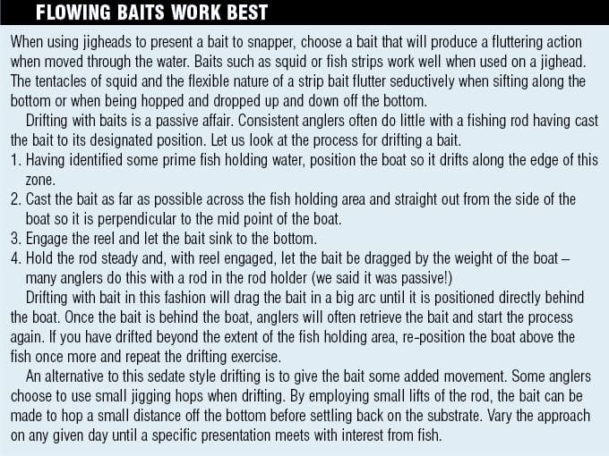 The results that drifting anglers are recording are impressive and make a lot of sense when you consider the strategy. Snapper are a fish that often move around a lot while feeding, regardless of what time of year you target them. Spring will often produce roving snapper schools that are being pressured by many boats that are often congregated in concentrated areas. Fish in these areas have a habit of becoming subdued where angling pressure increases. Schooling snapper are initially attracted to a type of structure. In the event that they are pressured by anglers and boats in one location, they will quite often move to surrounding areas of similar structure to escape the noise of anchors, anglers and fish being caught or hooked and lost. In some of these situations it is common to watch anglers drifting around anchored boats, catching some good fish. These anglers are quietly offering different presentations that the fish will often respond to favourably. The mobile approach means these anglers are also covering a greater amount of water and often encountering groups of fish that are moving around in an effort to avoid pressure from a group of boats. Drift fishing for snapper is an easy and effective technique and, where weather patterns enable the approach, is one that catches some anglers a lot of fish!