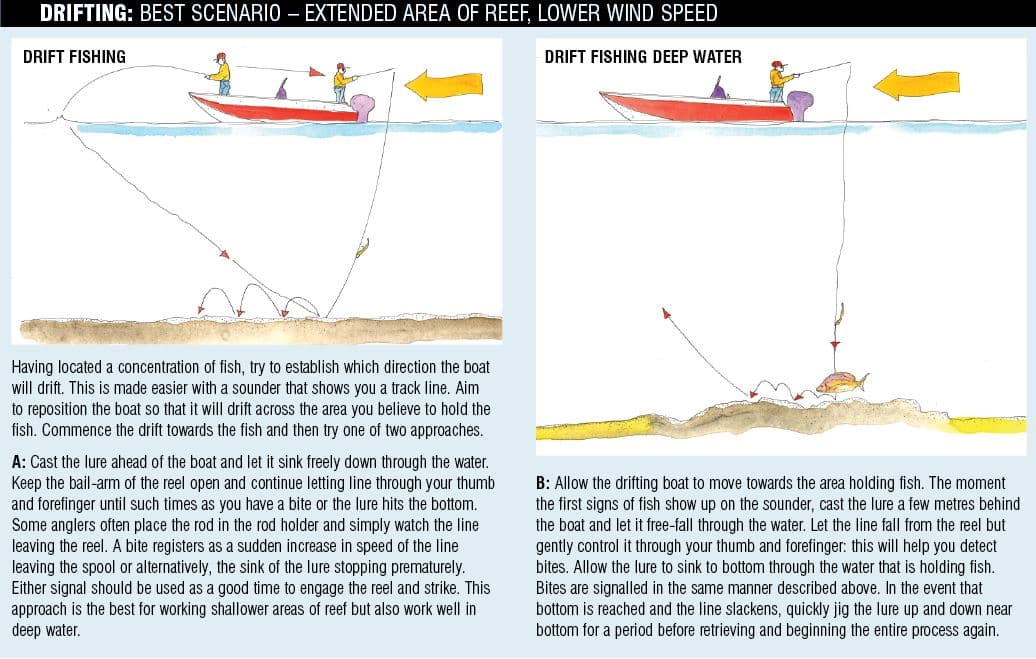 Ultimately there are two ways you can go about fishing escape pattern retrieves: drifting from a boat or at anchor. Many anglers choose to drift wherever possible because it allows the freedom to move around an area and stay in touch with moving bait and predators. This approach becomes a disadvantage however when dealing with very small patches of reef such as wrecks, and also when strong winds and currents make presenting a lure too difficult.