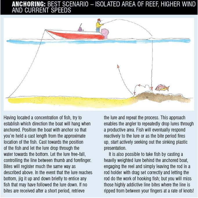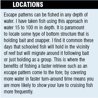 Ultimately there are two ways you can go about fishing escape pattern retrieves: drifting from a boat or at anchor. Many anglers choose to drift wherever possible because it allows the freedom to move around an area and stay in touch with moving bait and predators. This approach becomes a disadvantage however when dealing with very small patches of reef such as wrecks, and also when strong winds and currents make presenting a lure too difficult.