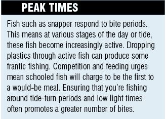 I believe jighead weight to be the most important aspect of creating the best escape pattern. The conundrum I face on any day when fishing plastics is based on whether to fish slowly sinking lures or fast sinking options. I know that fish like snapper love a slowly sinking bait or lure, but, they will also set upon an object sinking quickly through their midst. Fishing a combination of approaches is often the best way to ascertain which method is producing the most bites on any given day. The advantage of fishing an escape pattern imitation is that it allows you to work plenty of water a lot more quickly than a slow-sink retrieve. The key is to select a jighead that will get your lure to bottom quite quickly without it plummeting like a rock. Try to imagine how quickly a stray baitfish or prawn would try to get to the bottom and you have your answer regards sink rate. Try to select a jighead that replicates this speed and you’re well on your way to fishing a productive retrieve. Experimenting with different weight jigheads is the best way to find an optimal selection; this means having the box of jigheads close at hand, and not being afraid to change weights if you aren’t getting bites.