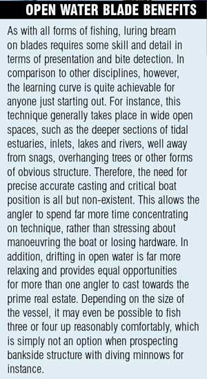 Ideally, depths of about 1.5 to 8 m are preferable, though blades can certainly be worked outside of this range. The most basic retrieve involves casting down breeze and ahead of a slow drift. Unlike fishing shallow flats where a stealthy approach is paramount, there’s usually no need to make extra-long casts with the fish schooling down deep. As the blade descends, keep in contact by maintaining a slight bow in the line. In my experience, bream will intercept a blade either on the drop, both after the initial cast and during a pause in the retrieve, or whilst it’s lying motionless on the sand or mud. Either way, hits usually occur within half a metre or less of the bottom. If a bream bumps, nudges or intercepts the lure before it reaches the bottom, the line with flicker or twitch ever so slightly, which is your key to lift the rod tip and set the hooks. Fail to detect this subtle indication and chances are you’ll miss the fish altogether. If the blade makes it through the school without getting hit and comes to rest on the bottom, the line will relax. From here, a simple lift and pause style retrieve is a good way to start. The idea is to feel the blade vibrate through the line and rod tip, but it must be kept close to the bottom at all times. A short, relatively swift rip of no more than about 20 to 30 cm, is all that’s required. When the fish are really switched on, a faster double-hop may elicit a more aggressive response. Similarly, three to four short sharp jabs, barely lifting the lure off the bottom, but at the same time generating plenty of energy and vibration, followed by a pause, often attracts some attention. Bream will also pick up a blade whilst it’s motionless on the bottom and the next time you lift the rod to impart action on the lure, you’ll feel weight. When this occurs, keep the rod moving back over your shoulder, take up any slack line and drive the hooks home. A number of fish are bumped off in this scenario, which can be frustrating. You may also foul hook quite a few in the side of the face or under the chin.
