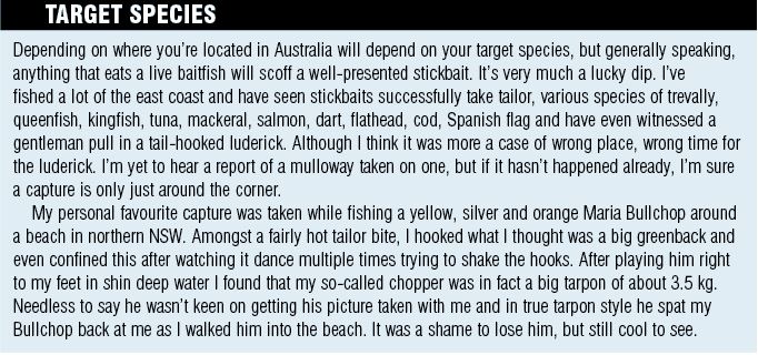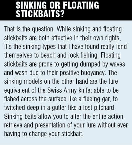 Stickbaiting has become an effective technique for a range of species due to advanced lure designs and tackle. Sammy Hitzke provides the low down on how to fish these fish catching bullets from the shore.