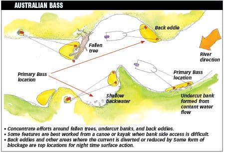 The bulk of my bass fishing is undertaken in rivers and creeks so we will look at the key areas to subdue fish in these environments. Undercut banks, back eddies and fallen trees are possibly the primary areas to find bass. These areas are particularly productive during daylight hours, however casts must be accurate and within half a metre of that feature if you want to generate a strike. As the sun dips down and the shadows lengthen, bass will move away from their daytime lair under the cover of darkness. At dusk, work areas within the direct vicinity of these features, as bass will be more alert and willing to hit a surface lure. The darker it gets, the more areas will open up for bass strikes. Deep channels or gutters running close to prominent snags as well as mid-stream boulders or trees will come into their own during the night. Any feature that will divert the current and create a sanctuary from the moving water is worth concentrating your efforts around.