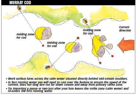 Some of the best areas to work surface lures include the edge of banks and shorelines where terrestrial life can be blown into the water. Overhanging tea trees and scrub, branches of trees and elongated canopies of eucalypts that are within close vicinity of the water’s edge are prime areas. Another proven feature to target cod in rivers and impoundments are rock formations that jut out into the main body of water. These spots offer ideal launch pads to nail any prey moving past.