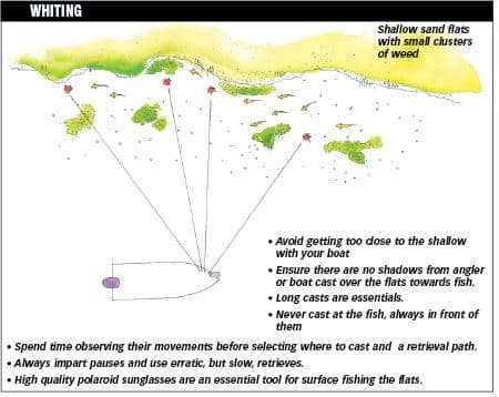 A key element of whiting on the surface quests is pinpointing the fish. Whiting are so well camouflaged that at time they are almost invisible. This is where you need to look for the moving shadows because as good as whiting are at hiding themselves, they can’t hide their shadow. ‘Casting at shadows’, as I often refer to it, often means using your powers of observation before casting. Watch the fish for a few minutes before starting to cast as it is important to get an idea of where and how the whiting are moving around.