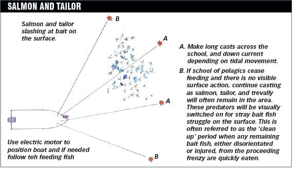 If the school has gone down, continue to cast in the area you think the fish may have moved to. The predators will still be switched on and on the look out for any baitfish that may have been stunned or wounded during the frantic boiling and slashing of fins, tails and scales. We have taken some of the biggest salmon and tailor using this method. Finally, slow your retrieve down and impart a few long pauses if the school has gone off the boil as this will give the predators marginally more time to find your presentation.
